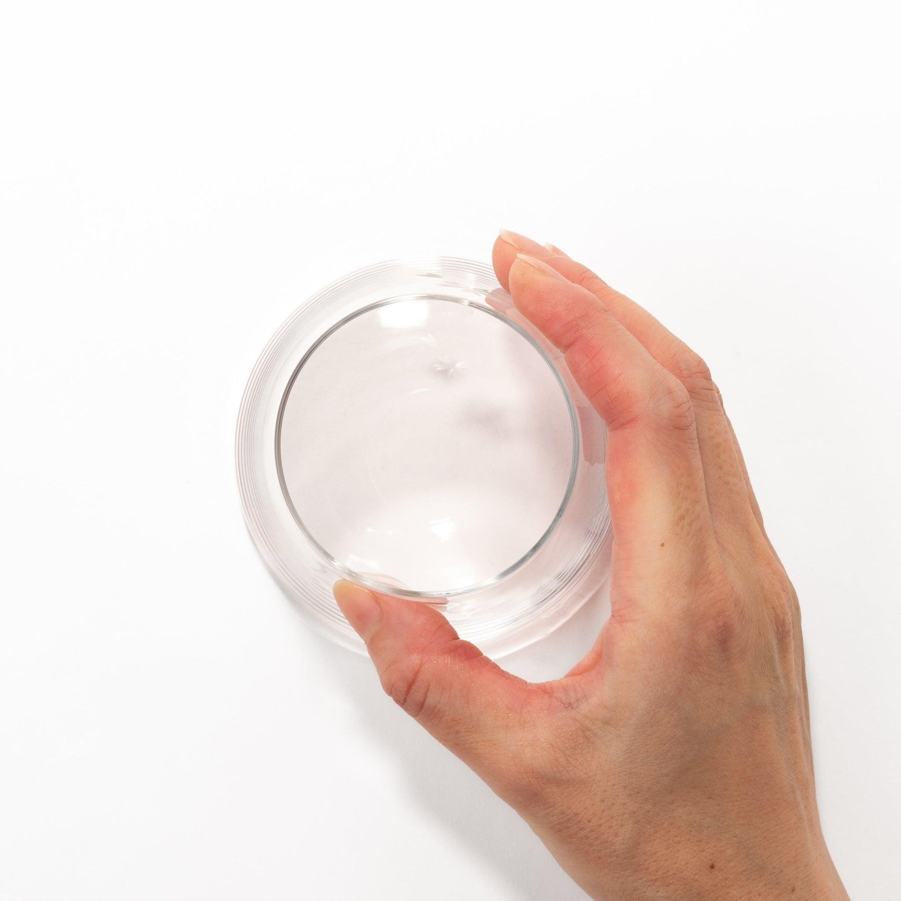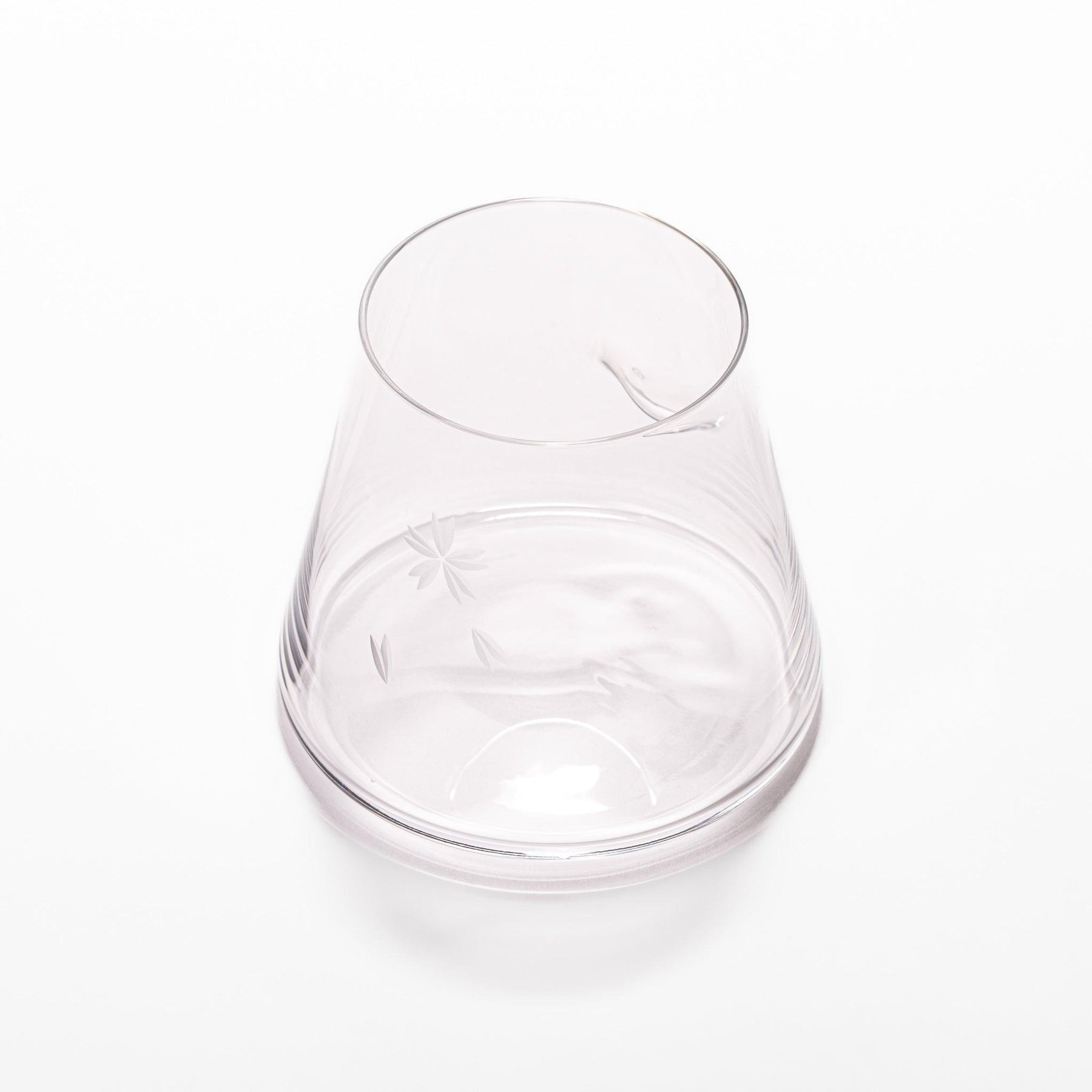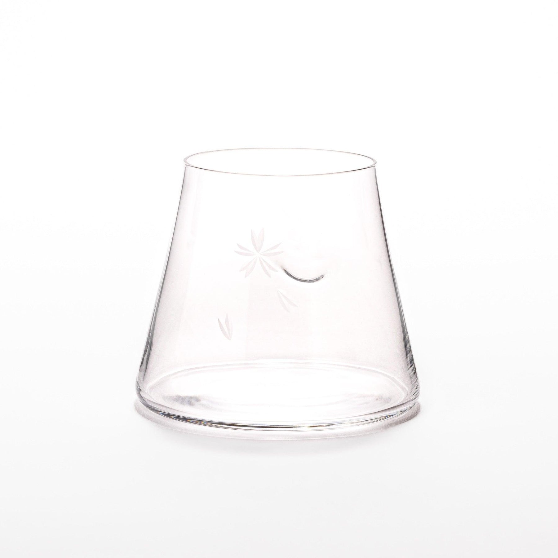 Along the side, a subtle indentation mirrors the shape of the Hōei Crater, formed during Mt. Fuji’s historic Edo-period eruption. This detail is more than symbolic. It creates a natural thumb grip that makes the glass comfortable to hold. Clear and minimalist in design, the glass highlights both the beauty of the pour and the elegance of restrained craftsmanship.