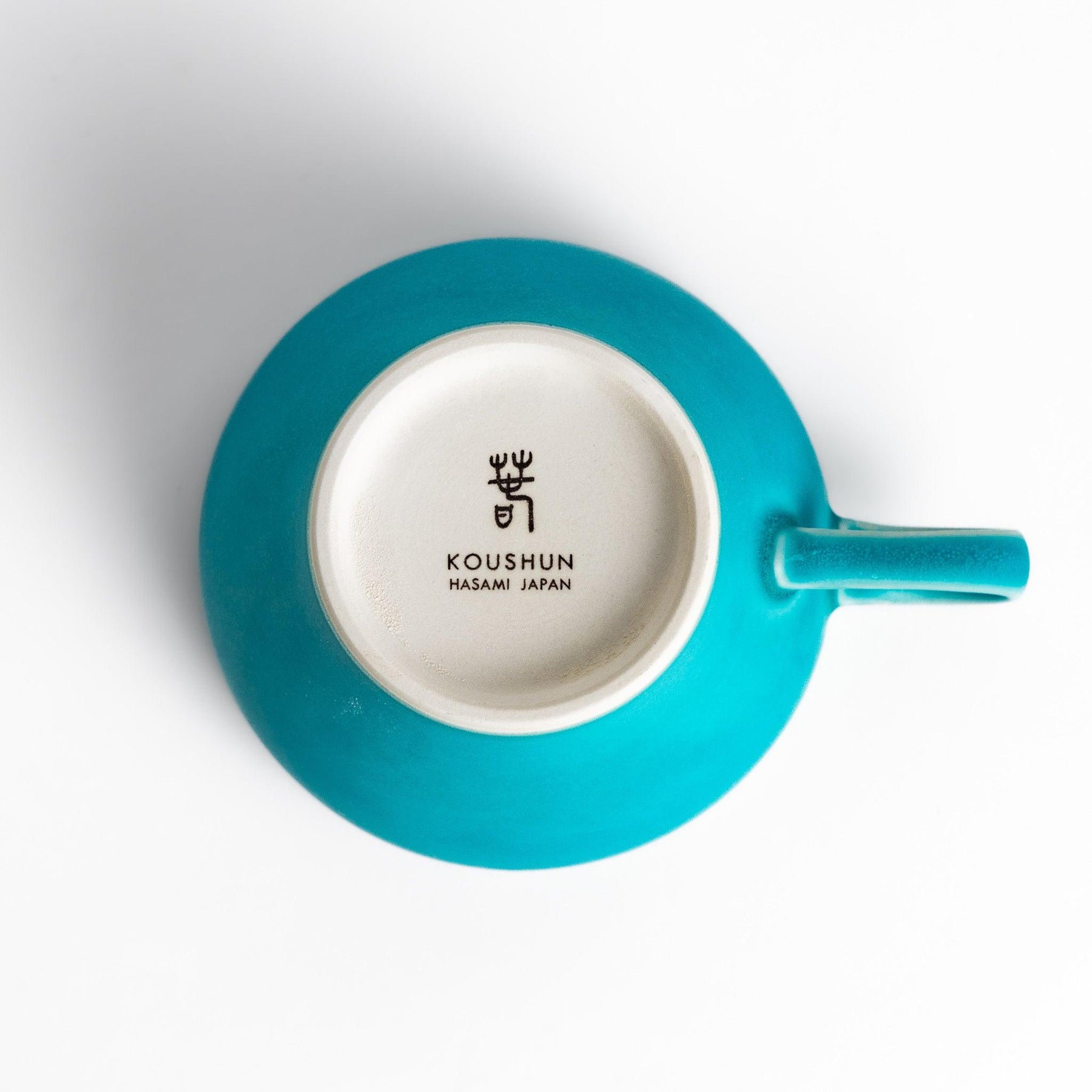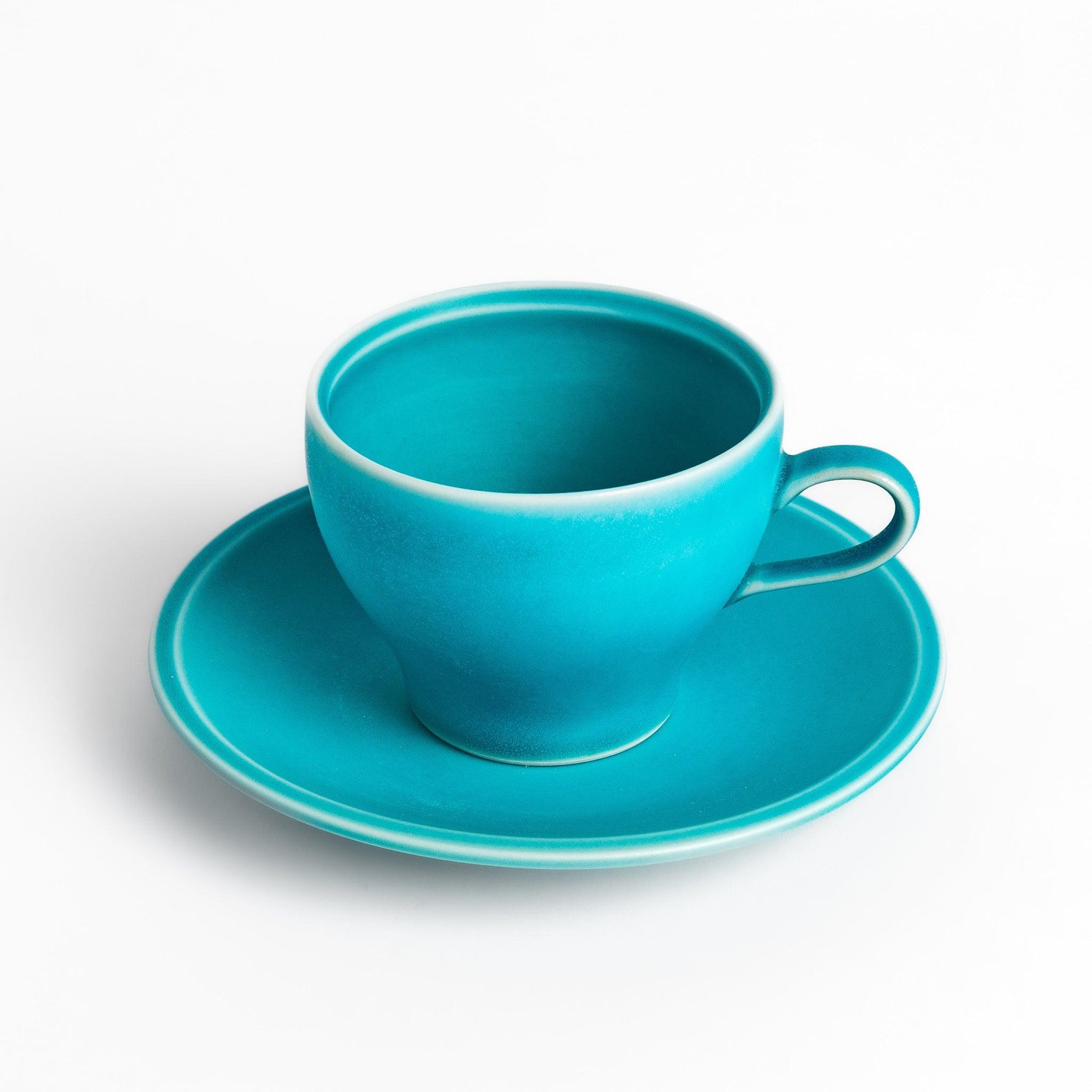 The Turkish Blue Coffee Cup & Saucer reflects the clear light of morning, its turquoise glaze glowing with a brightness that feels both refreshing and calm. Crafted in Hasami ware, the cup rests gently in the hand with slender lines and a soft matte surface that adds a quiet elegance. The saucer mirrors this simplicity, creating a balanced pair that brings harmony to the eye.