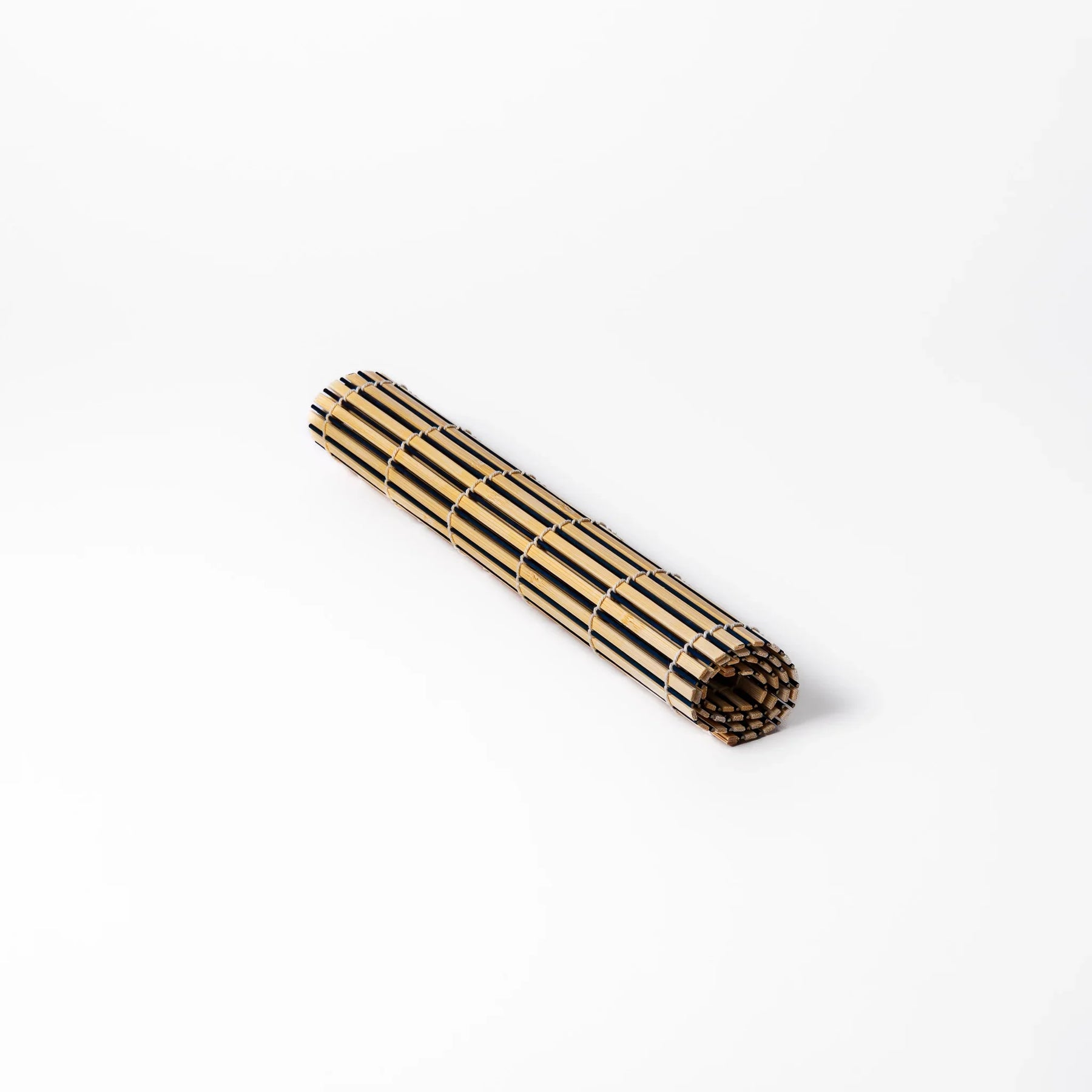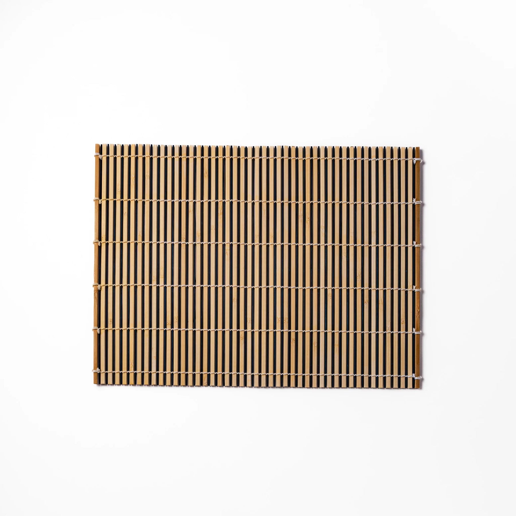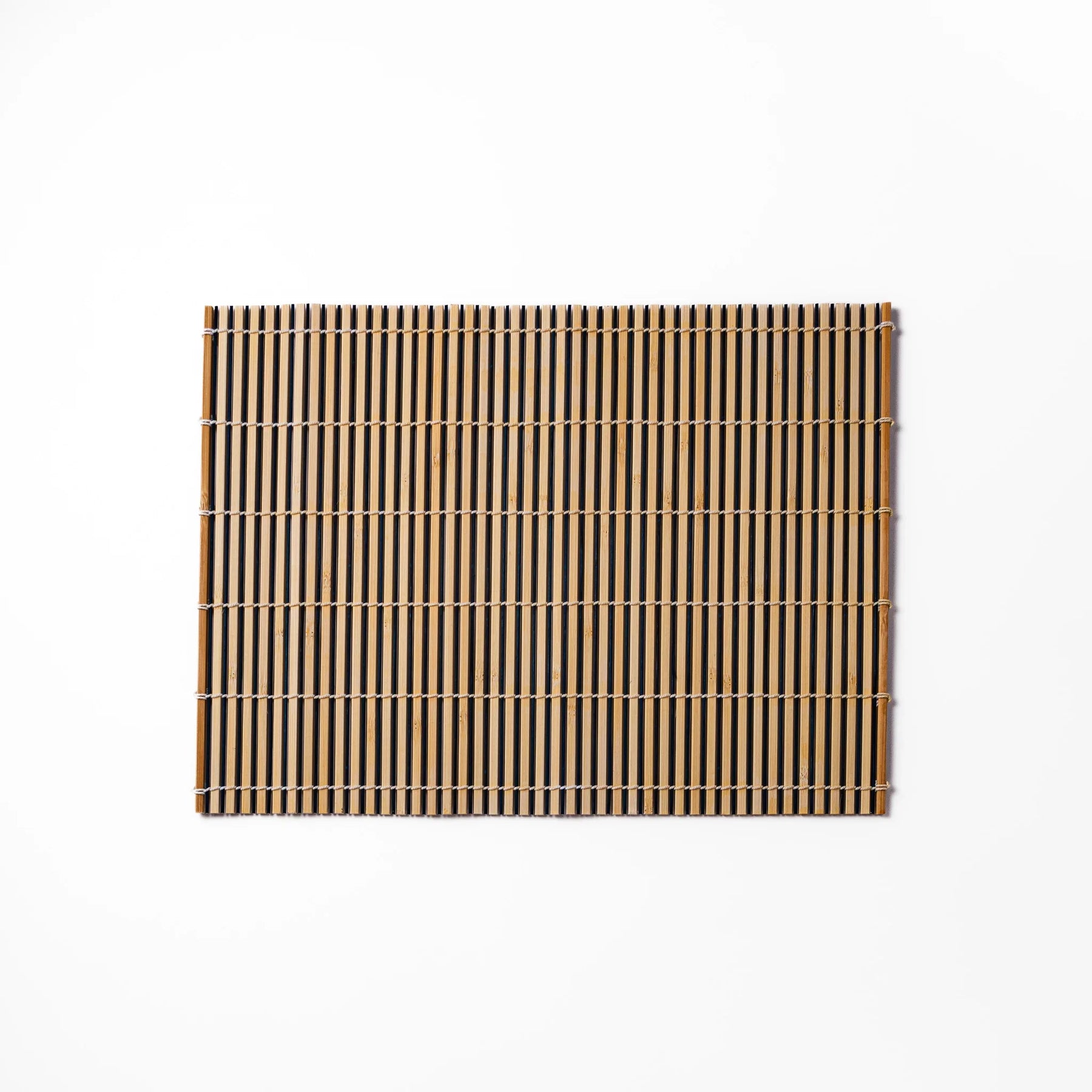 Two-tone bamboo table mat with alternating light and dark slats, tightly woven with white cord—ideal for adding texture to your Japanese table setting.