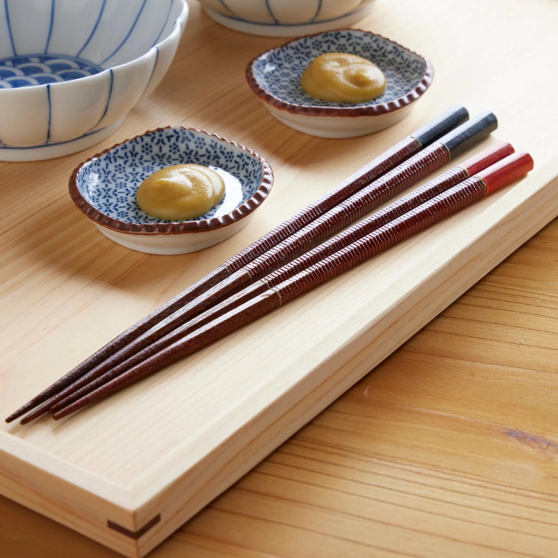 The Vermilion & Black Urushi Line Chopstick Set brings together two pairs of finely crafted wooden chopsticks, one finished in classic vermilion and the other in deep black. Each pair is adorned with subtle linear detailing, enhanced by layers of glossy urushi lacquer that reveal the warmth of the natural wood beneath. The careful handwork creates a luminous surface with an understated elegance, balancing tradition and modern refinement.