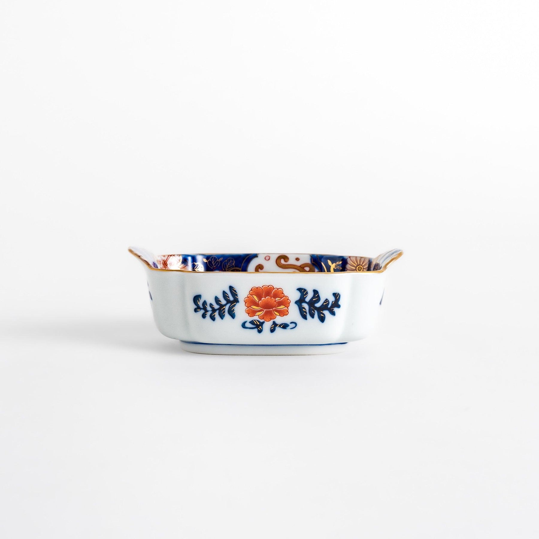 The Pine Bamboo Plum with Crane Condiment Bowl by Shobido Honten is a graceful piece of Imari Ware that carries deep cultural symbolism. Adorned with pine, bamboo, plum blossoms, and a crane, it combines motifs long associated with resilience, renewal, and longevity. Rendered in vivid hues of red, blue, green, and gold, the design glows with festive brilliance while maintaining timeless elegance.