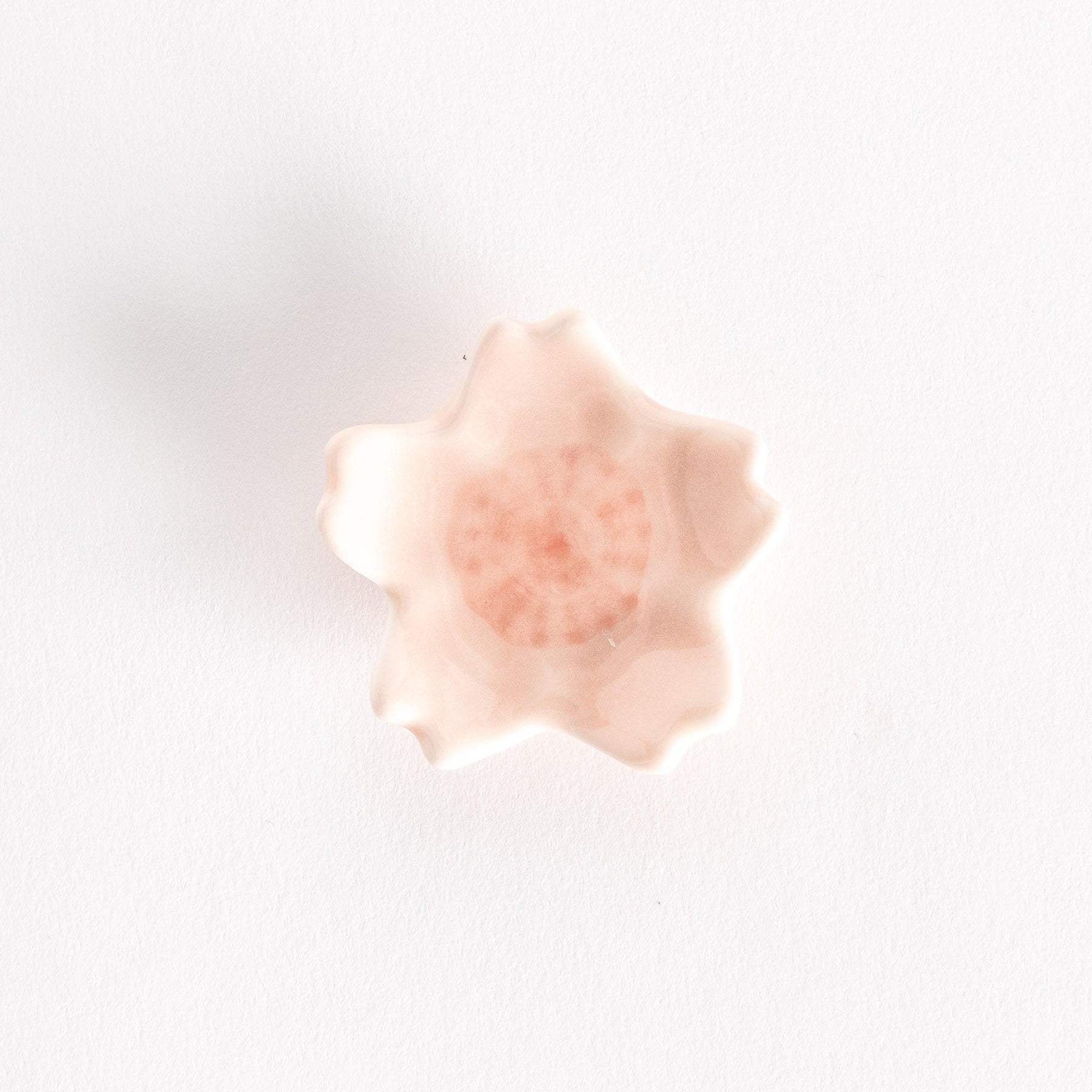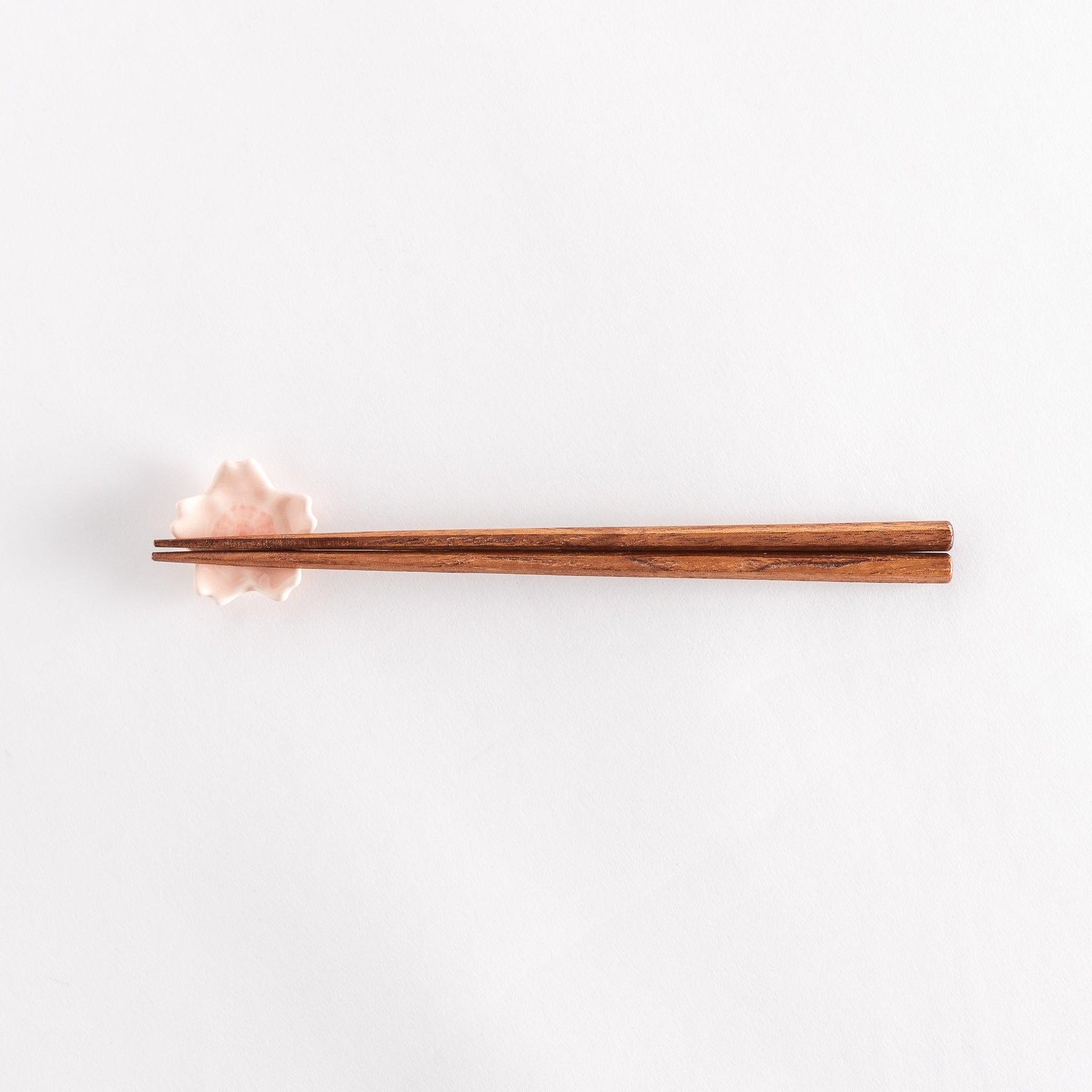 Pink cherry blossom-shaped chopstick rest with a soft, pastel finish and intricate flower center details.