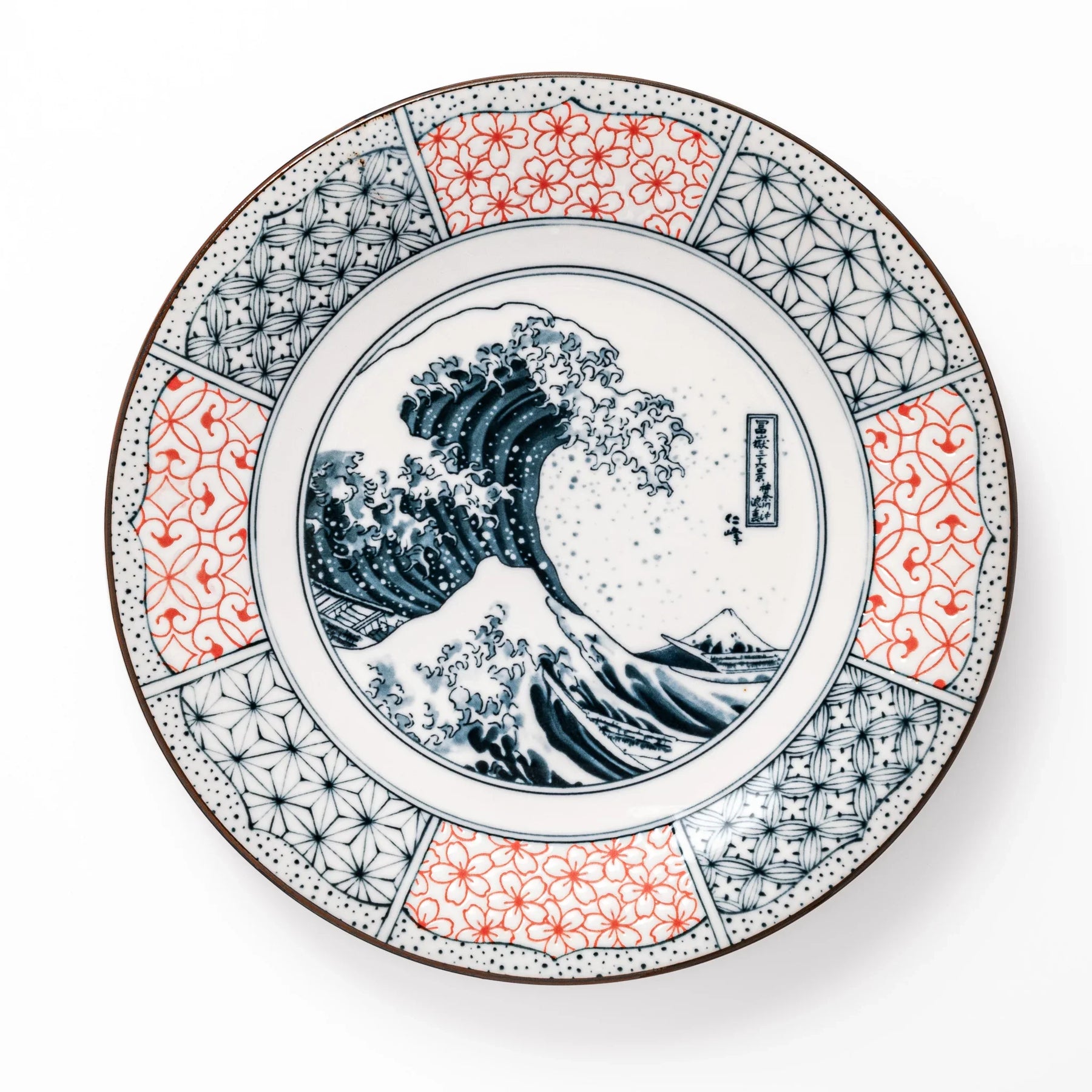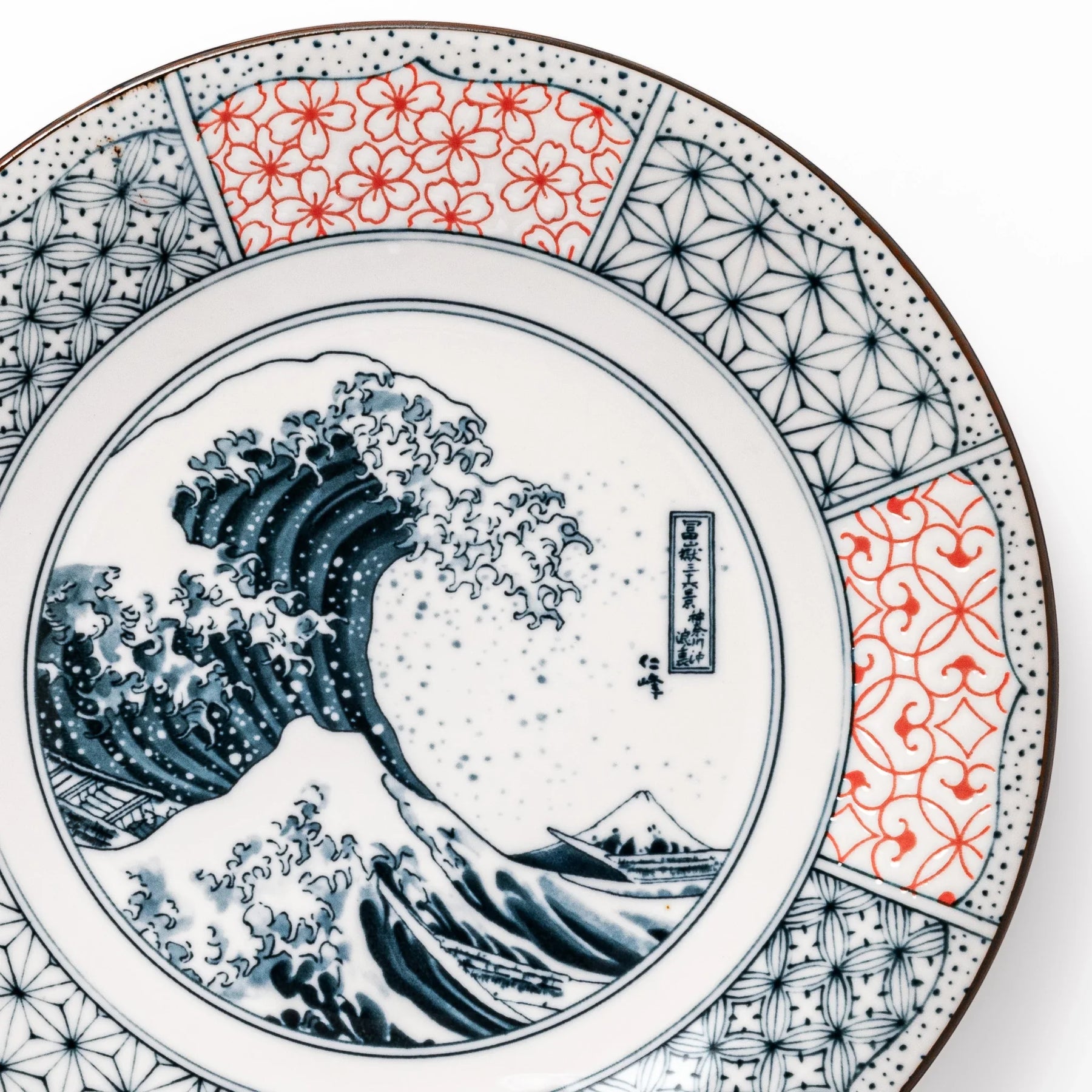Celebrate one of Japan’s most iconic artworks with the Blue Hokusai Wave Dinner Plate, a striking porcelain piece featuring The Great Wave off Kanagawa at its center. Rendered in delicate sometsuke (cobalt underglaze), the dynamic wave towers over distant Mt. Fuji, encircled by panels of intricate red and blue geometric patterns in the Shonzui style.