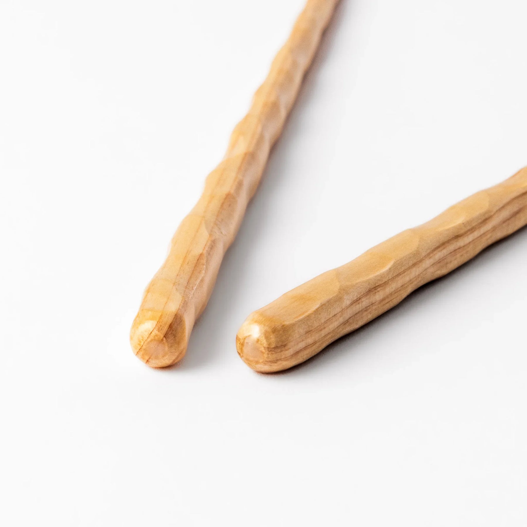 Japanese Hinoki wood carved chopsticks with textured hand-carved surface, lightweight design highlighting natural grain.