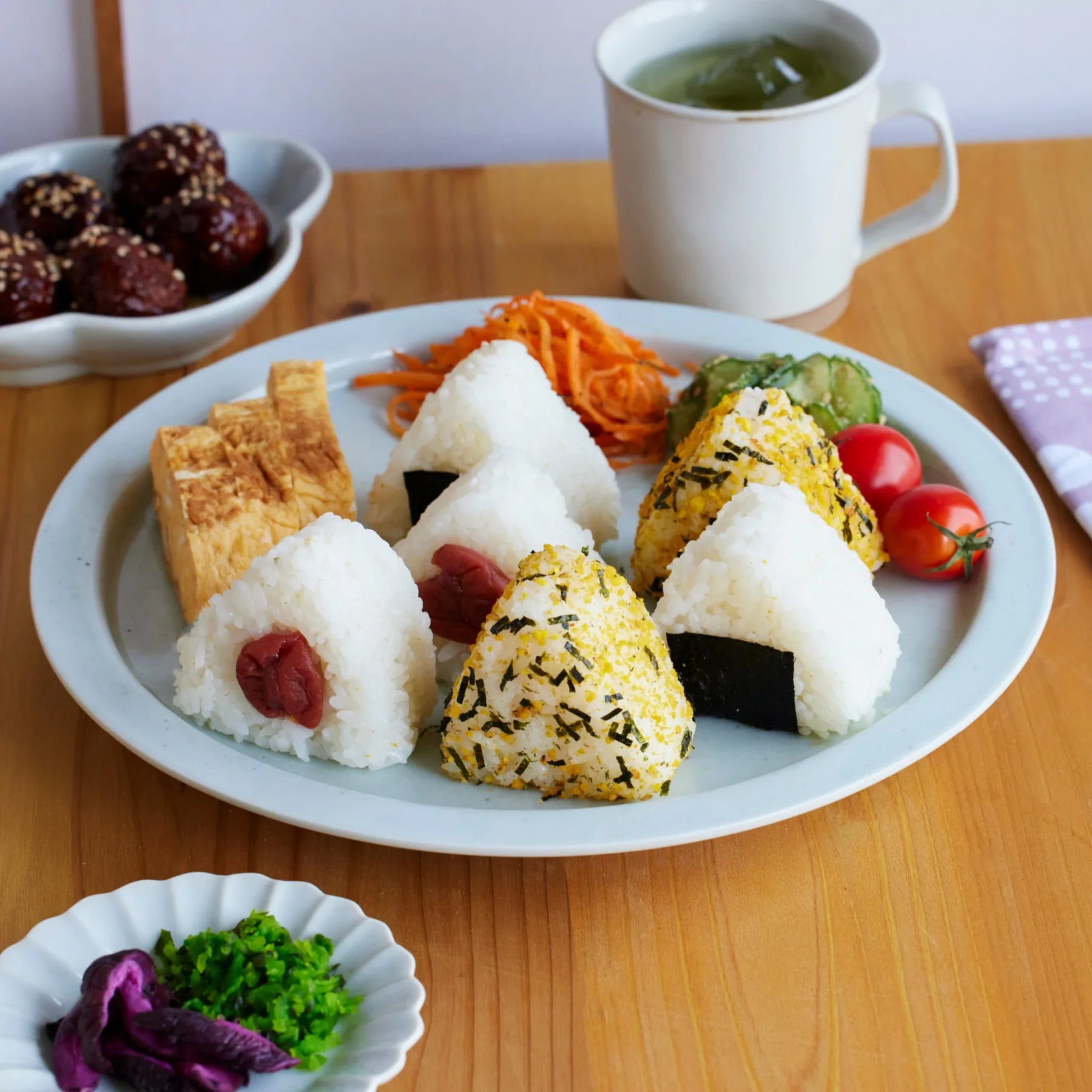 Japanese onigiri rice balls with umeboshi seaweed and furikake served with tamagoyaki vegetables and tea on a wooden table