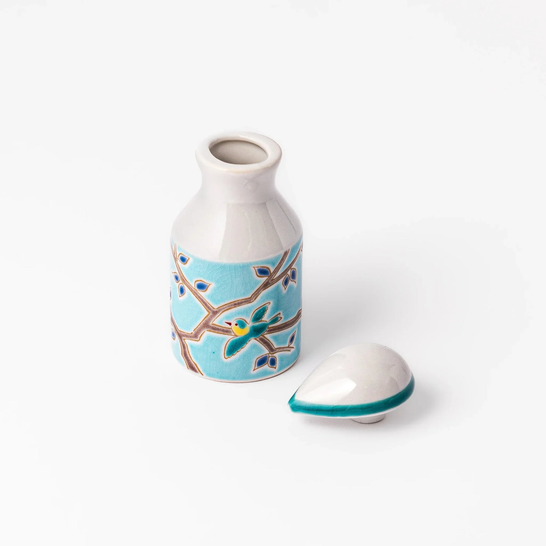 The scene evokes warmth, serenity, and the joys of togetherness. The turquoise-trimmed spout offers smooth and accurate pouring, making it ideal for soy sauce, ponzu, or other liquid condiments. Perfect for daily use or seasonal table settings, the Twin Songbirds Soy Sauce Dispenser brings quiet beauty and craftsmanship to your mealtime ritual.